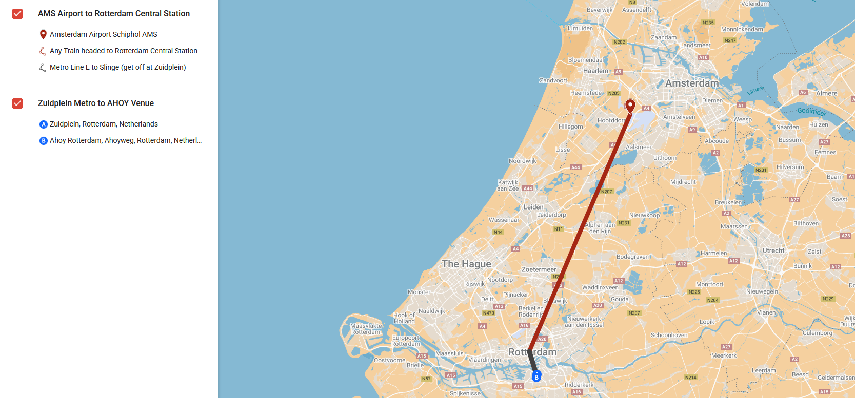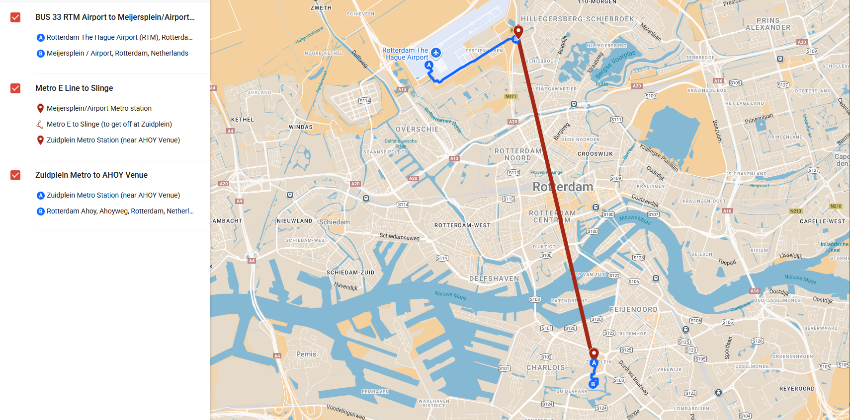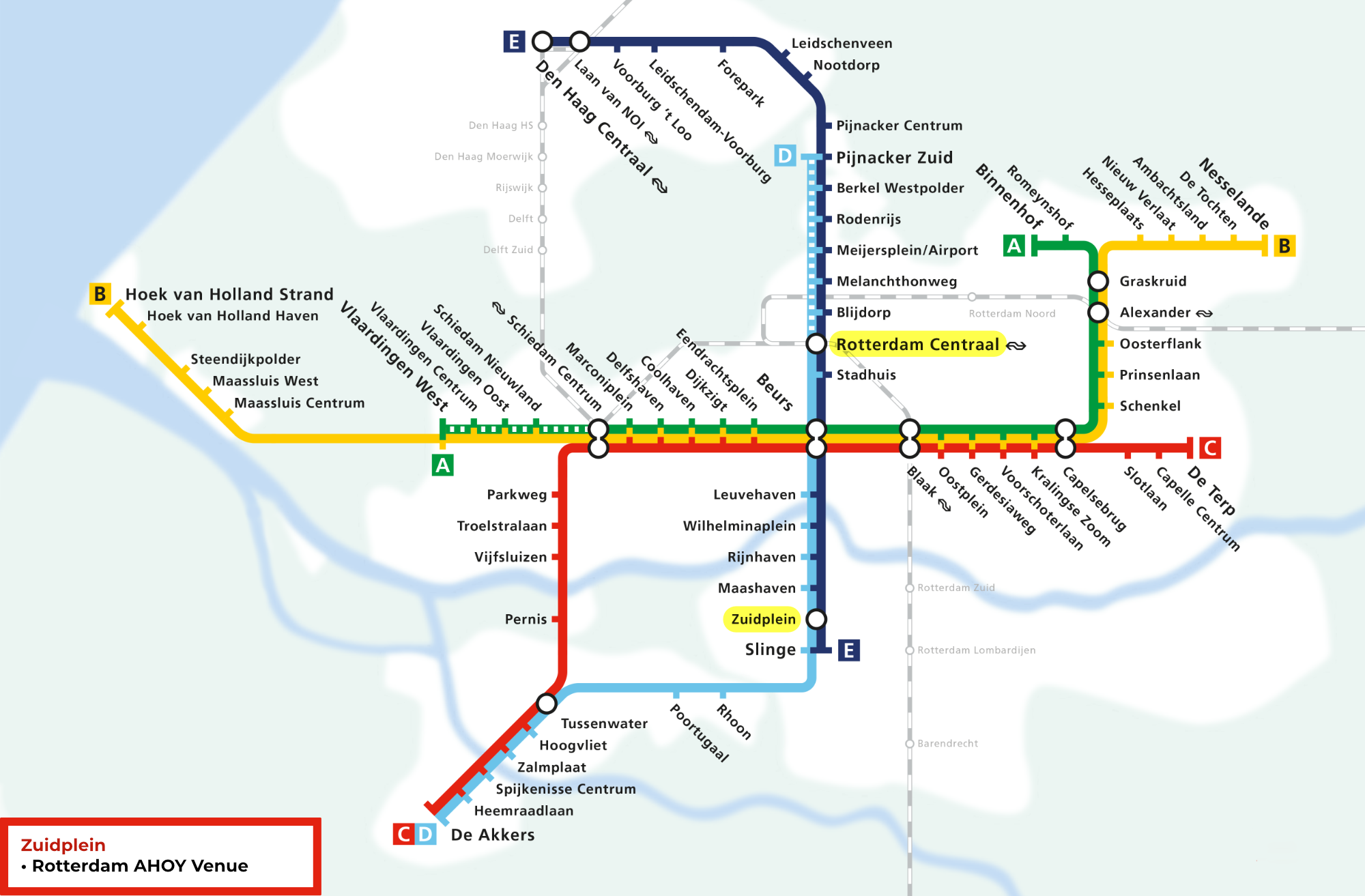 • The best and fastest way to reach the AHOY venue is by taking Metro Line E headed to Slingle and getting off at Zuidplein station. The venue can then be reached via foot is only 11 minutes.